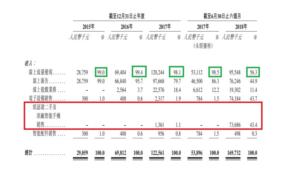 招股说明书显示,2018年上半年鲁大师电子设备销售收入同期增长9362.2%,这主要得益于2017年8月起公司新增了经认证二手及原厂智能手机销售业务。数据显示,2018年上半年鲁大师手机销售收入为7368.6万元,占当期总收入的43.4%。