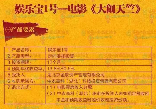2016年4月7日,京金联作为承销平台,推出“娱乐宝1号”理财产品,以投资王宝强贺岁电影《大闹天竺》的名义向投资人募集资金,期限一年,年利率14.30%,按月付息。其具体模式为,湖北京金联资产管理有限公司作为受托人,通过平台向大众融资,所融资金用于电影拍摄,上映后的票房再进行分配,将盈利返还给投资人。