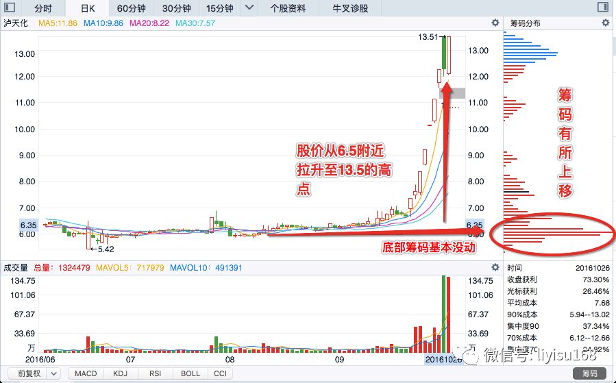 泸天化(000912)是近期的一支大牛股,从底部6.5左右的价格,8个交易日内拉升到了高点的13.51,走出了翻倍行情,但很多持有这支个股的投资者在中途赚了20%-30%就已经选择了离场,殊不知通过紧盯主力筹码完全可以跟着主力享受这一波翻倍的利润。