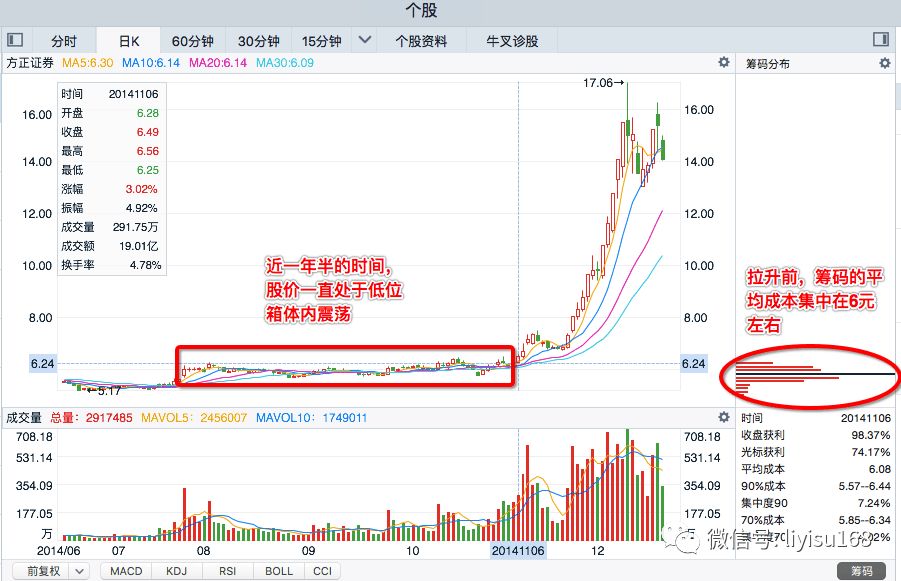 如图(四)所示,为方正证券在本轮行情的收尾阶段。在股价持续震荡横盘的过程中,累计换手率超100%,也就是常说的高位高换手。从图中我们可以明显的看到,从2014年12月9号创出17.15元的新高到2015年1月16号这个横盘的过程中,下方6元处主力最原始的建仓筹码及上方12元以下所有的“抬轿”筹码在不断地减少,直至消失一空,完全完成了股价从低价转移至高价位的全过程,主力也因此享受到了一波完整的“筹码差价”所带来的巨大收益。
