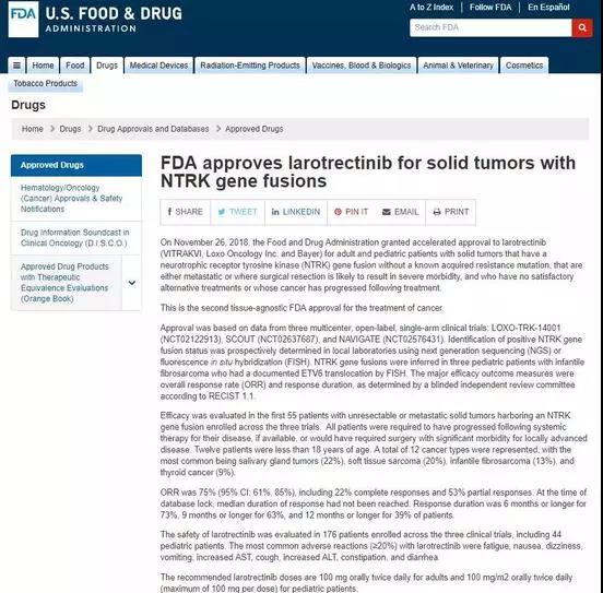 美国时间11月26日,抗癌药物Vitrakvi在美国正式上市。Vitrakvi成为了第一个正式批准上市的口服TRK抑制药物,同时也是第一个与肿瘤类型无关的“广谱”抗癌药。