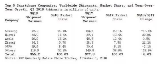 此前11月,国际数据公司(IDC)的调查数据指出,2018年第三季度,全球智能手机出货量为3.552亿部,同比下降了6%。这是全球智能手机市场连续第四个季度出现同比下滑。尤其是在中国,从当年超20%的市场份额跌落到如今的1%左右。