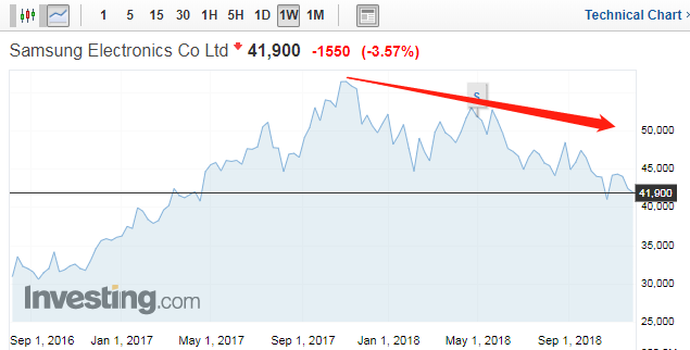 图注5、在韩国上市的三星电子股价周线走势图,(截图来源于Investing.com)