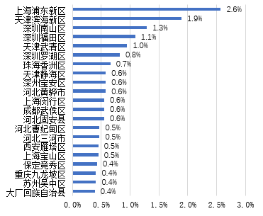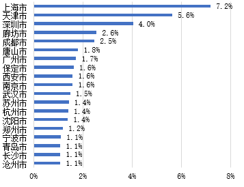 具体到城市层面,主要分布在两类地区,即发达城市和其都市圈外围城市。其中上海市、天津市、深圳市吸收北京市制造业投资排名靠前,占比分别为7.19%、5.6%和4%,廊坊市排名第四,占比2.56%。在投资前20位城市中,北京都市圈外围唐山市、保定市、沧州市等均在列。