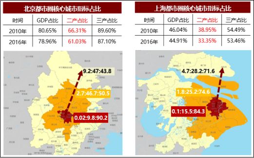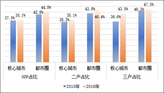 目前,成熟都市圈的产业开始跨行政区转移,而成长型都市圈的产业则从城市核向城市圈和都市圈转移。以北京、上海为例,2010-2016年,北京市GDP占都市圈GDP总量的比重由80.65%下降到78.96%,其中二产从66.31%下降到61.03%;上海市GDP占比从46.04%下降到44.91%,二产从38.95%下降到33.35%。两个成熟都市圈的产业已经跨行政区向外圈层转移。