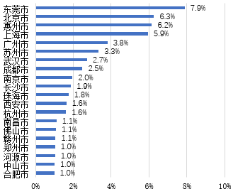 注:图中数据指北京市制造业在各城市投资企业数占所有对外投资企业数的比重,下同。