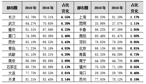 表都市圈外围区域(除城市核外)第二产业占全域比重变化(2010-2016年)