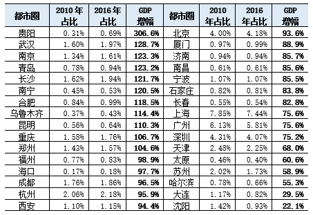 图32个都市圈GDP全国占比及增幅(2010-2016年)