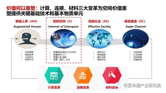 空间价值如何重塑?我们认为,新技术、新产业通过正在形成的全球创新网络渗透到人及物理空间的各个层面中,会形成增强人类、智联空间、高能社会、超级通道四层新的智慧系统。