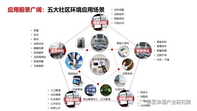 智慧社区产业具体丰富的应用场景,在智联空间的最小单元——智慧家庭中,拥有门厅、客厅、厨房、卧室、浴室、书房6大应用场景;再上一层的智慧楼宇中,产业应发挥公共安全、楼宇自控、信息网络三大功能、16个细分功能;在智慧社区中,产业应发挥居家安防、智慧物业、紧急求助、智慧政务、智慧设施等五大功能;在最外层的智慧城市中,也需要产业的相应产品和服务来实现,如五大室内的场景可以视为智慧家庭、智慧楼宇的放大,而五大室外场景实现的前提则一部分来自智慧社区的首先建立。