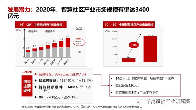 中国消费市场的“巨国效应”,将为产业提供巨大的发展空间。预计到2020年,中国智慧社区产业市场规模将达近3400亿元,成为智能硬件产业中占比最高(30.1%)的细分领域。加计智能电器、智慧服务的规模,产业市场规模将突破万亿。