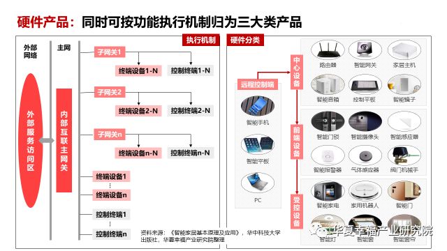 目前,各应用场景对应的硬件品类已超百个,还有大量的创新空间。同时,还可以从另一个角度来理解硬件的分类,即按功能的实现机制分类——在远程控制终端或中心控制设备的指令下,前端设备、受控设备通过协作来完成具体的某一项或某几项功能。