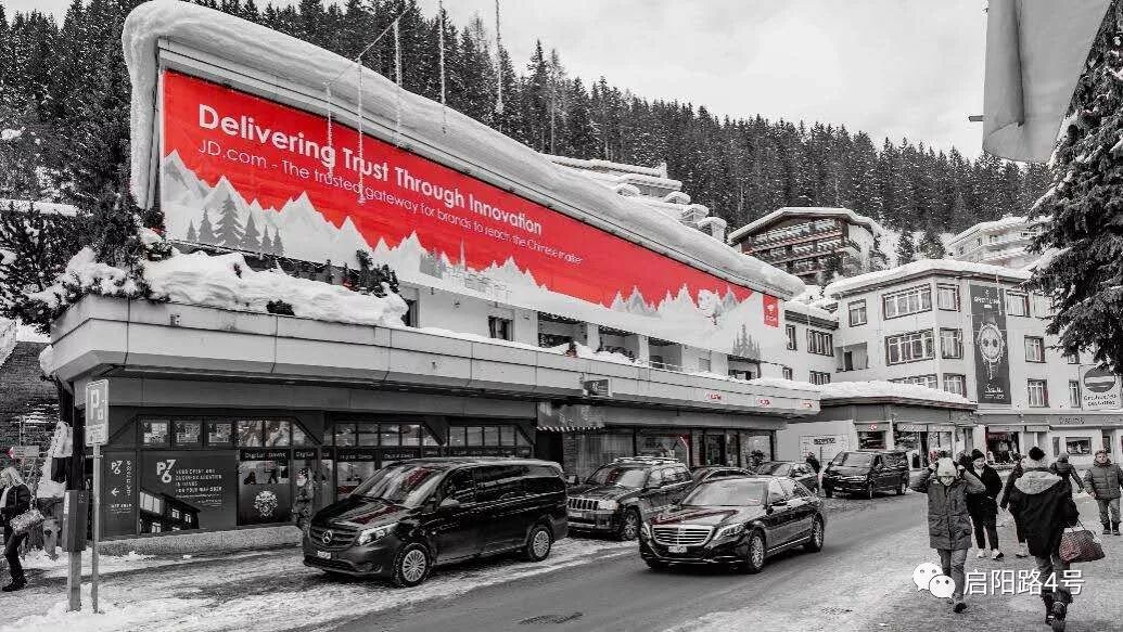 “Delivering Trust Through Innovation(创新传递信任)”,在达沃斯的主干道普罗姆纳大街上挂着京东巨大的广告牌。