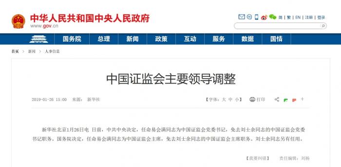 1月26日下午,国务院在官网发布公告,宣布中国证监会主要领导调整。