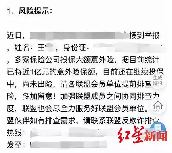 农历新年刚过不久,2019年2月15日,国内有保险公司收到了一封来自保险某行业联盟的“风险提示”。某大型股份制人寿保险公司核保部门相关人士透露,这份“风险提示”事实上发送给了多家保险公司,内容是该联盟近日接到举报,某王姓投保人在多家保险公司投保大额意外险,保额已将近1亿元,且该客户还在继续投保。目前该客户尚未出现,“风险提示”提醒各家保险公司提前排查风险,必要时联系反欺诈排查热线。
