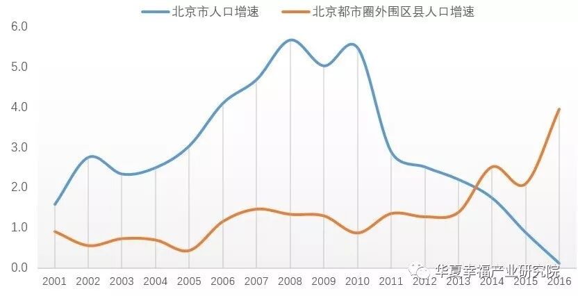 图5 2001-2016年北京都市圈核心区与外围区县人口发展增速变化(%)