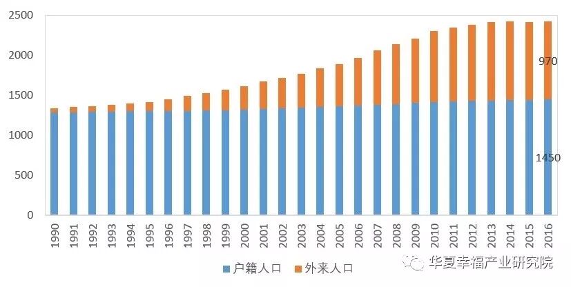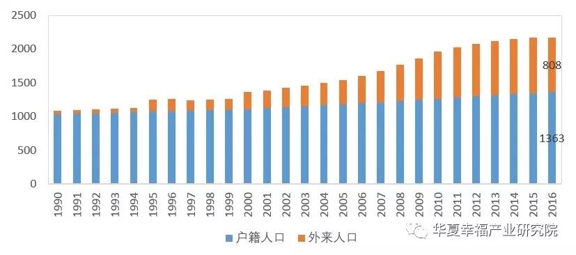图3 1990-2016年上海户籍人口和外来人口规模变化(万人)