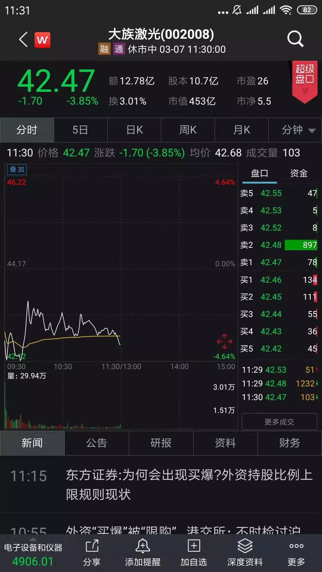3月6日,大族激光股价高开低走,从开盘涨8.64%到收盘时上涨4.52%,而今天大族激光又继续下跌,上午最低一度跌破4%。