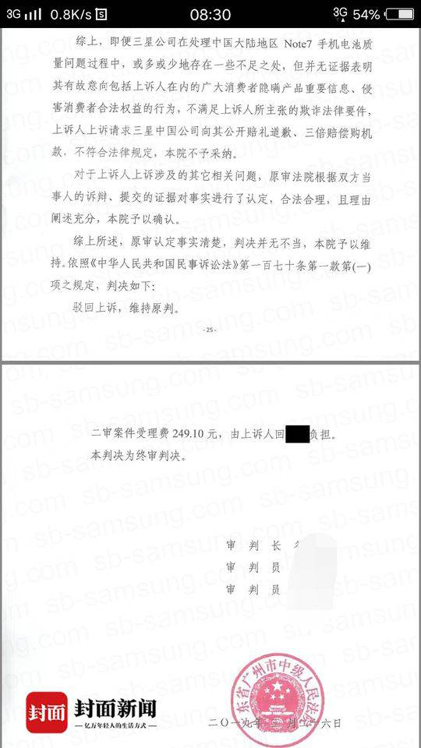 封面新闻消息,4月1日,封面新闻记者从北京三星Note7炸机机主回先生处获悉:其起诉三星中国公司三倍赔偿爆炸的手机并涉嫌欺诈案,日前由广州市中级人民法院作出终审判决,维持原判。