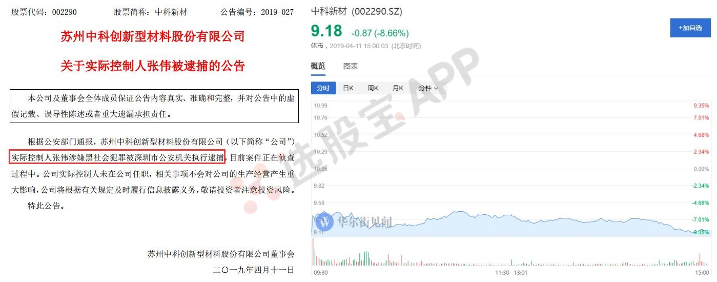 中科新材今早公告称,实际控制人张伟涉嫌黑社会犯罪被深圳市公安机关执行逮捕,目前案件正在侦查过程中。