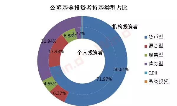 分类型统计看,截至2018年末,个人投资者持有股基占比6.88%,持有债基占比2.72%,持有混基占比17.48%,持有货基占比71.97%,持有QDII基金占比0.80%,持有另类投资基金占比0.14%;机构投资者持有股基占比4.64%,持有债基占比31.94%,持有混基占比6.37%,持有货基占比56.61%,持有QDII基金占比0.36%,持有另类投资基金占比0.09%。