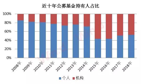 公募基金2018年年报数据显示,截至2018年末,公募基金市场个人投资者持有份额合计66185.92亿份,占比52.38%;机构投资者持有份额合计60168.90亿元,占比47.62%。个人与机构几乎各占半壁江山。
