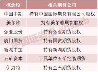 首先是参股期货公司概念股,包括中国中期、美尔雅、弘业股份、厦门国贸、新湖中宝等。