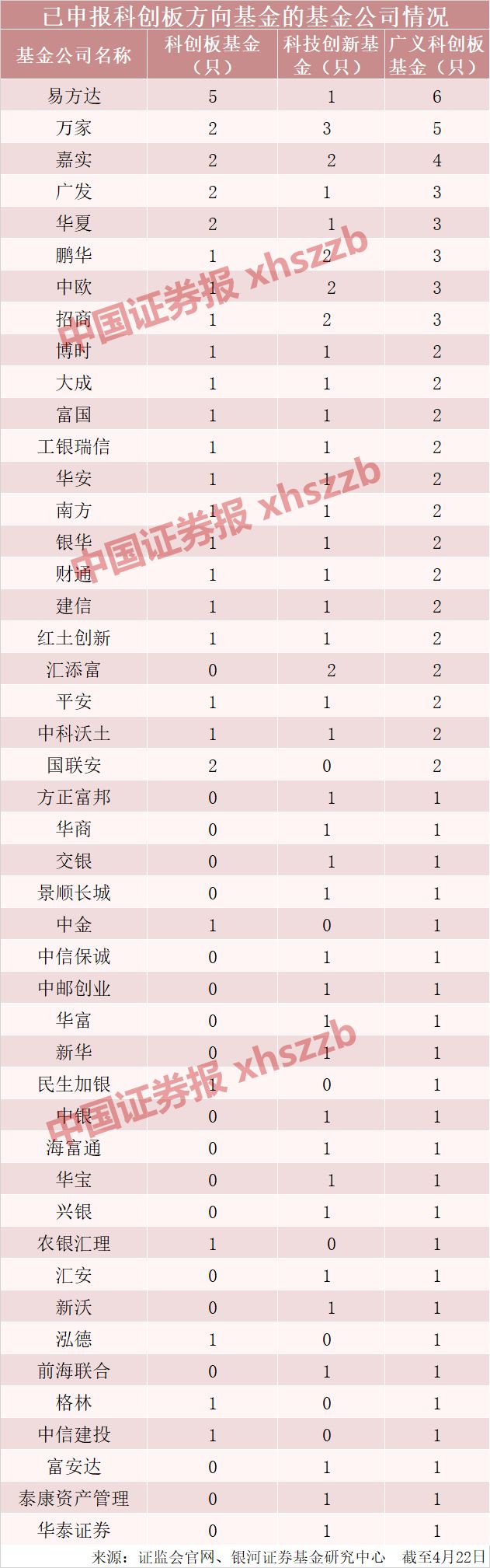 据中证君统计,截至4月22日发稿,已申报的科创板方向基金已达82只,获得一次书面反馈的达65只。另外,根据相关政策要求,监管也允许现有可投资A股的公募基金投资科创板股票,主要是权益类的股混基金和2018年年中成立的6只战略配售基金。