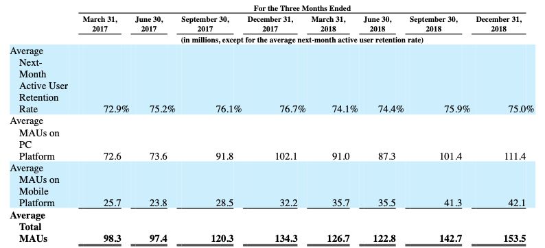 在招股书中,斗鱼自称中国最大的以游戏为中心的直播平台,这主要是从2017年第四季度和2018年第四季度的平均月活跃用户数、活跃用户日均花费时长和前100位游戏主播数量三方面来看。