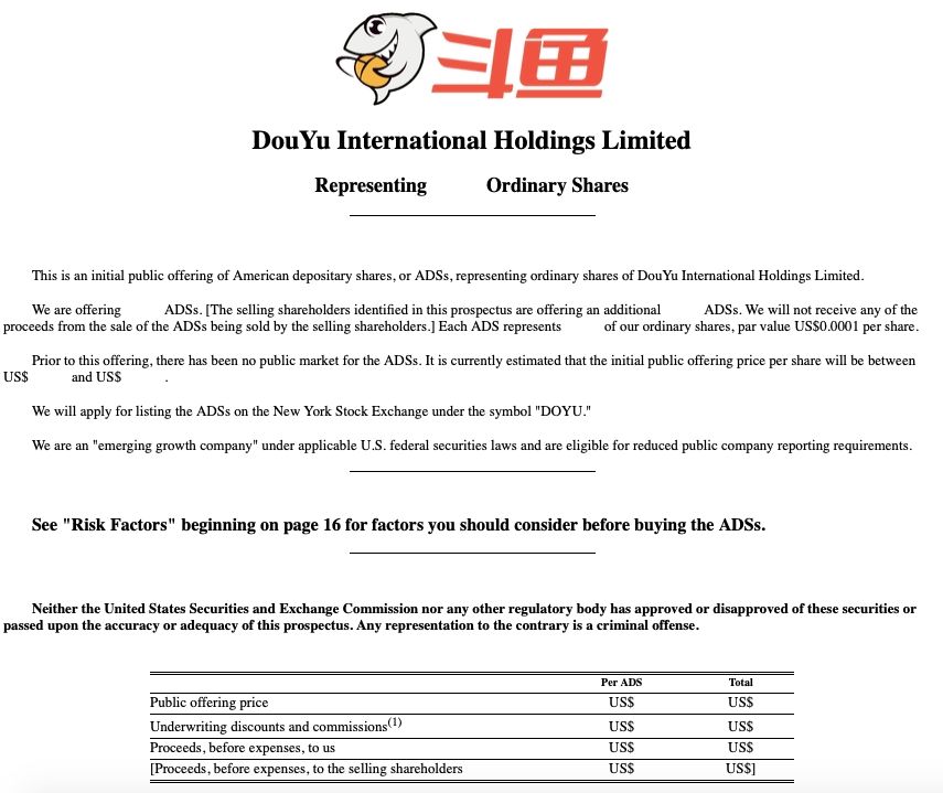 北京时间4月22日晚间,斗鱼向美国证监会递交了招股说明书,计划赴纽交所挂牌,交易代码“DOYU”,预计融资规模5亿美元,摩根士丹利、摩根大通和美银美林为本次IPO承销商。
