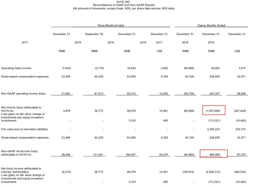今年3月5日,虎牙直播披露了上市近一年后的业绩数据。2018年,虎牙总营收达人民币46.63亿元,同比大增113.45%;净利润-19.38亿元,同比大降2293.15%。不过在非美国通用会计准则下,2018年归属于虎牙的净利润为4.61亿元。