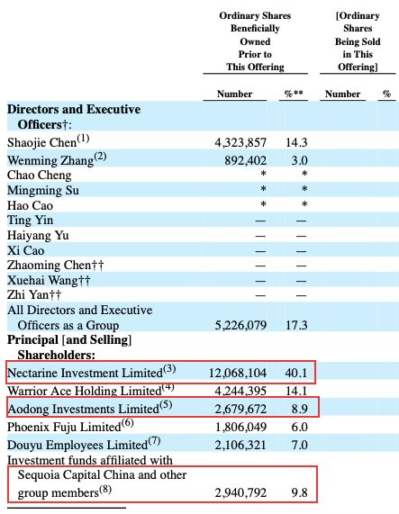 斗鱼的高管和董事持股17.3%,其中联合创始人陈少杰持有14.3%,另一位联合创始人张文明持有3.0%。斗鱼员工公司持股7.0%。