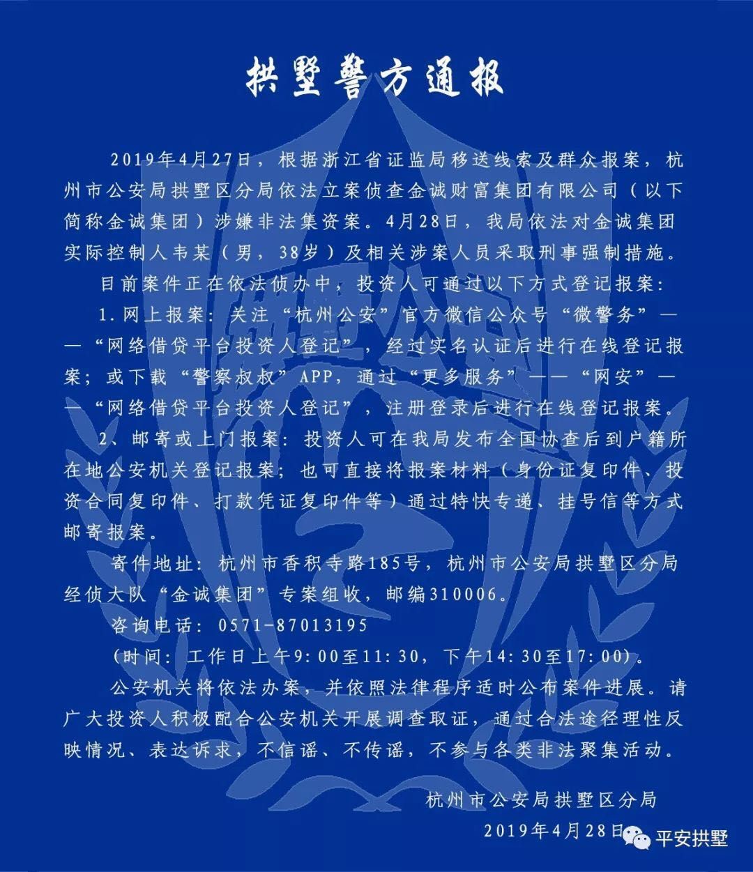 拱墅警方通报:4月27日,根据浙江省证监局移送线索及群众报案,杭州公安局拱墅区分局依法立案侦查金诚财富集团有限公司涉嫌非法集资案。4月28日,杭州公安局拱墅区分局依法对金诚集团实际控制人韦某(男,38岁)及相关涉案人员采取刑事强制措施。