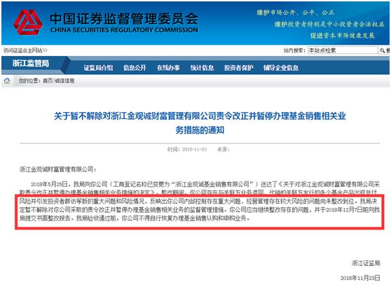 6个月之后,浙江证监局在去年11月23日再发通知,称其整改不到位,基金销售业务继续暂停,需要公司在2018年12月7日前提交书面整改报告,在验收通过之前不得恢复基金销售认购和申购业务。