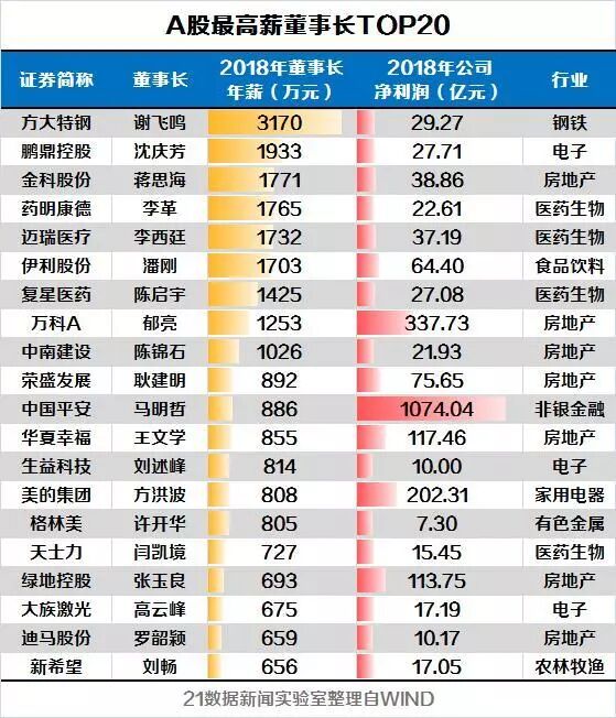 其中,薪酬最高的为方大特钢(600507.SH)董事长谢飞鸣,年薪为3169.67万元,然而谢飞鸣2017年薪仅为203.78万元,排名为191位!一年薪酬猛涨2966万元,实在是一飞冲天!