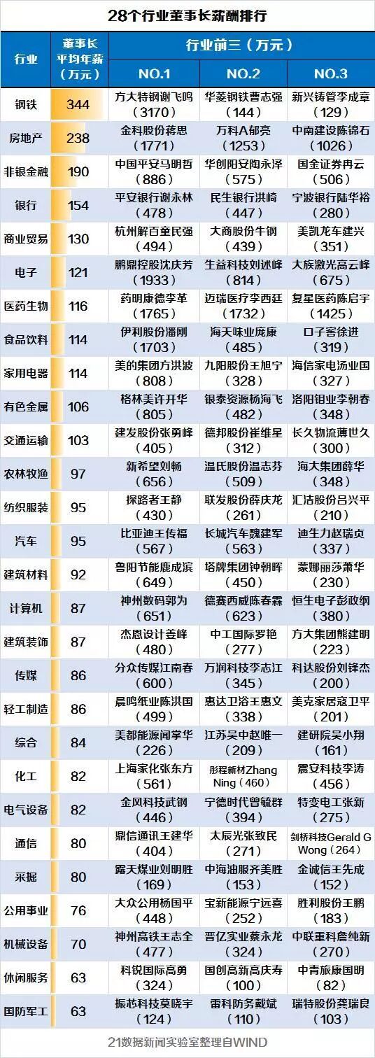 钢铁行业名列前茅,主要是方大特钢谢飞鸣拉高了平均水平。该行业第二、第三名,年薪均低于150万。