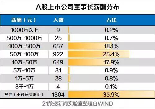 同时,年薪在10万至50万之间的有649位董事长,100万以上的有691位,500万以上的有34位,1000万以上的有9位。