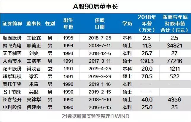 10名执掌上市公司的90后中,年纪最小的要数顺灏股份(002565.SZ)的董事长王钲霖,出生于1995年,年仅24岁,2018年7月25日开始正式担任公司董事长,他的年薪也较低,为2.5万元。