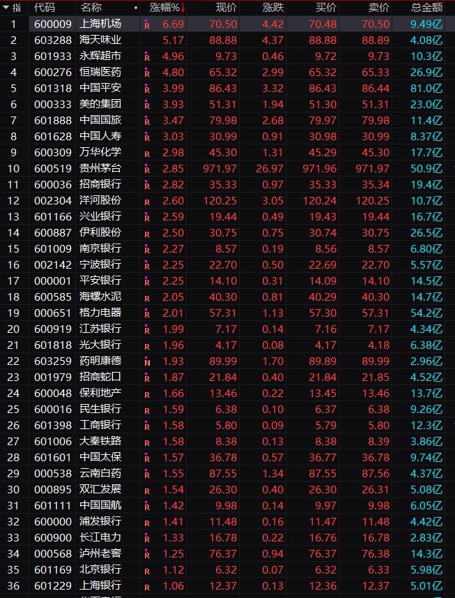 权重的漂亮50股票,又走出逆势大涨行情。海天味业大涨逾5%,恒瑞医药大涨4.8%,中国平安大涨3.99%,美的集团涨3.93%,贵州茅台涨2.85%,招商银行涨2.82%。