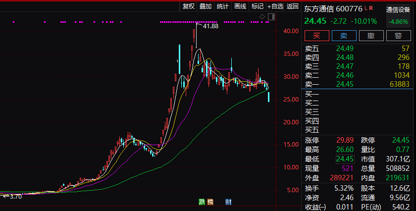 本轮5G概念的10倍妖股东方通信,今日也倒头破位跌停,从3月8日高位下来跌幅已经高达42%。