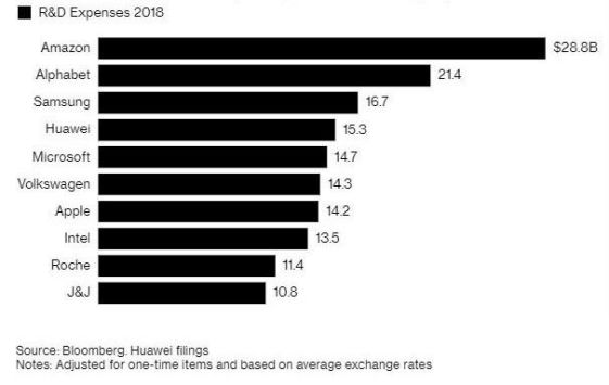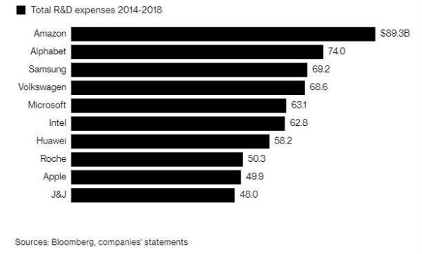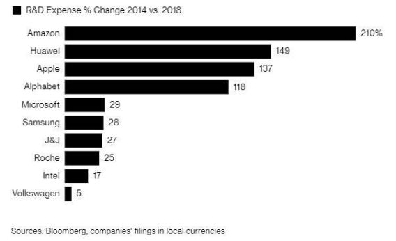 彭博新闻社还做了一个统计,即这十家公司在2018年的研发支出,较2014年研发支出的增长率。按此指标排名,公司顺序分别是亚马逊(210%)、华为(149%)、苹果(137%)、谷歌母公司Alphabet(118%)、微软(29%)、三星电子(28%)、强生(27%)、罗氏制药(25%)、英特尔(17%)和大众汽车(5%)。