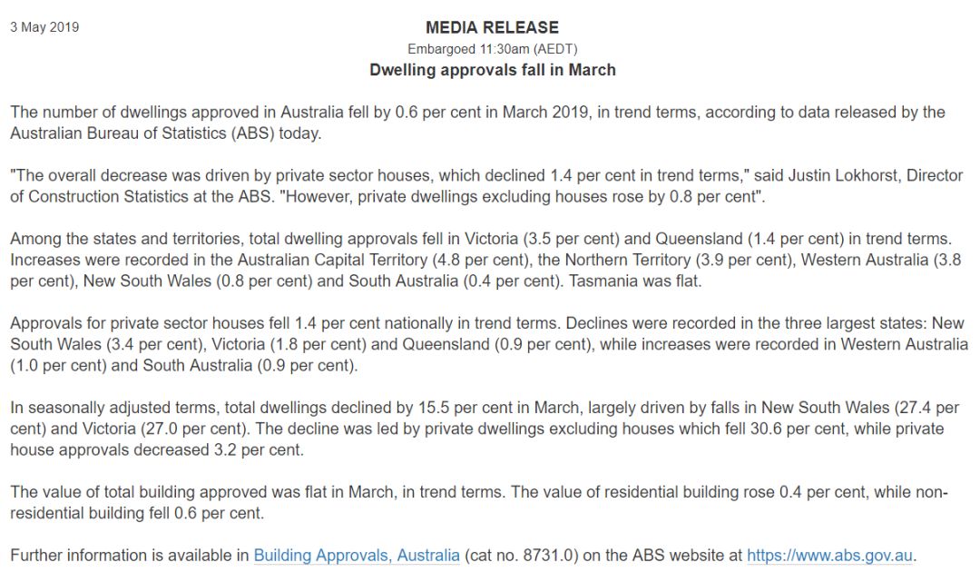 澳大利亚统计局数据显示,2019年3月该国获批建设的住房量下降了0.6%