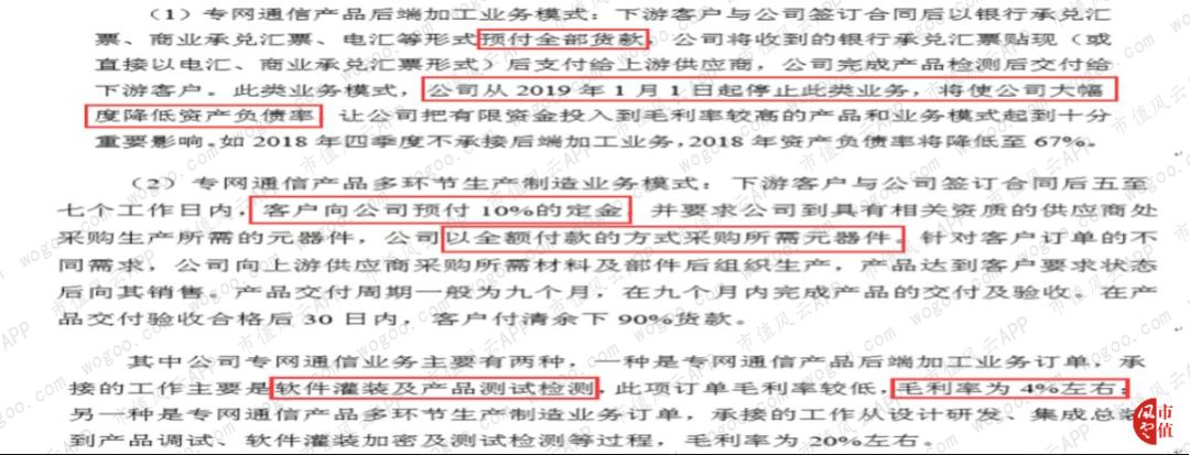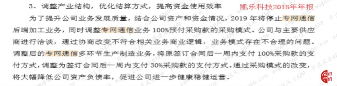 但在凯乐科技披露的2018年年报中,公司称考虑到公司的资金情况,2019年将停止专网通信后端加工业务,并调整专网通信业务100预付款模式,主要是将专网通信多环节生产制造业务100%预付改成30%的采购预付,以降低公司的资产负债率。