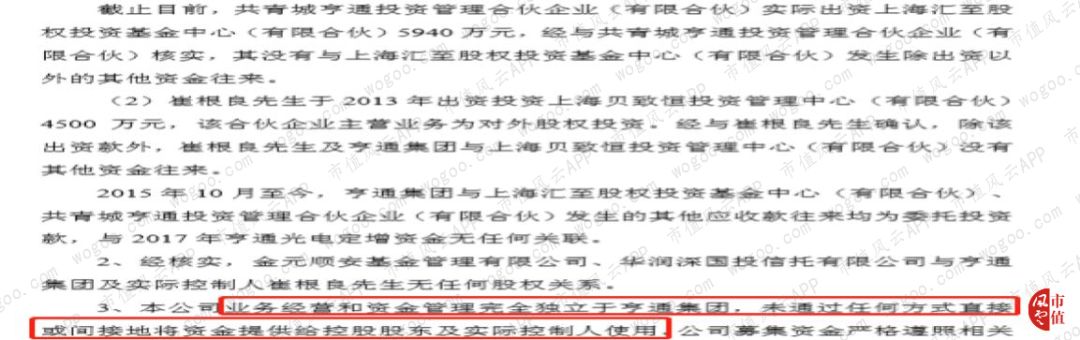 虽然亨通光电已经澄清说,亨通集团层面的其他应收款对象与亨通光电定增对象之间,虽然存在部分密切关系,但仅仅限于出资、委托投资款之类的资金往来;而且上市公司层面的业务经营和资金管理完全独立于亨通集团,未通过任何方式直接或间接的方式将资金提供给控股股东及实际控制人使用。