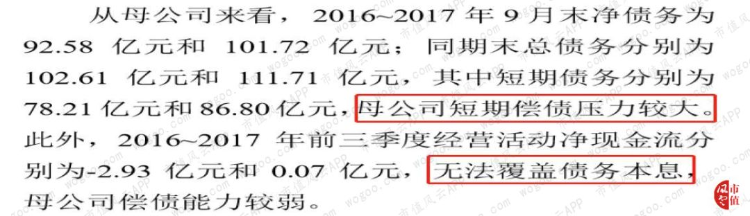 亨通集团是上市公司亨通光电的控股股东,旗下有光纤光缆、贸易以及其他多元化业务。据亨通集团2017年债券评级报告来看,亨通集团母公司就存在短期债务压力大、经营性现金流无法覆盖本息的情况。