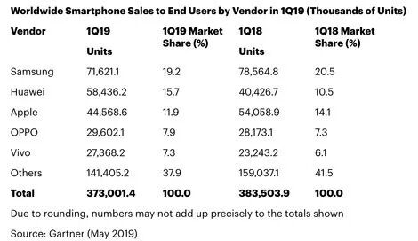 根据第三方机构Gartner最新研究数据,今年3月,苹果iPhone在全球智能手机市场的份额降至11.9%,销量从5410万台下跌至约4460万台;三星份额从20.5%降至19.2%,但仍位居第一;华为智能手机市场份额从10.5%上升至15.7%,反超苹果,位居第二,销量为5840万台;OPPO和Vivo份额分别从7.3%和6.1%升至7.9%和7.3%。