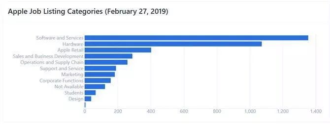 根据数据挖掘网站Thinknum显示,从2016年到2018年第三季度期间,苹果官网招聘页面中,主要招聘信息都集中在硬件工程方面,而在2018年第三季度以后,需要的软件工程师职位数量已经超过硬件工程师了。这一数据的变化一定程度上体现苹果业务方面的转型。