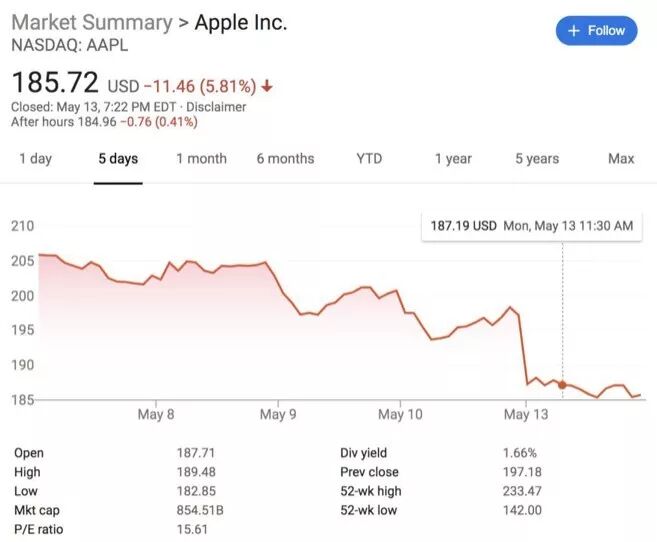 而美国法院这一判决的结果,意味着之前苹果看似冉冉升起的服务业务被横砍一刀,一夜之间,股价重挫近6%,市值蒸发580亿美元,约合人民币3894亿元,相当于一个特斯拉。