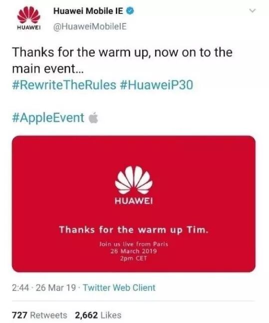 有趣的是,在苹果发布会之后,华为连夜发了一条推特,感谢其为华为P30系列发布会进一步造势。