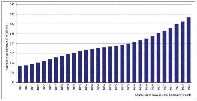 从苹果这一季度营收组成可以发现,苹果的服务业务占据着第二的位置。这一季度,服务业务收入为114.5亿美元,占总营收的20%,对比上季度,同比增长13%。根据财报披露,苹果的服务业务主要包括iTunes、Apple Music、App Store、iCloud以及Apple Pay等。